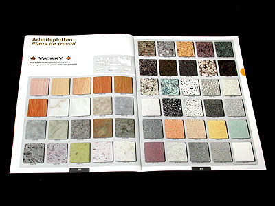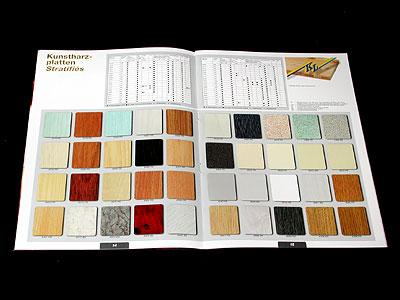 Produktverzeichnis zur Materialbestimmung von Kunststoffplatten, Echtdarstellung von Farben und Oberflächen, Tabelle für Lagerhaltung und Verfügbarkeit, 4-farbig, Griffregister simuliert mittels Signatur Gestaltung, Aufnahmen, Satz+Litho, Proof, Korrektur anhand der Originale |